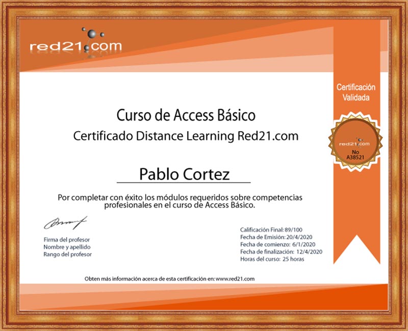 Al presentar, y aprobar la prueba final, recibirás un certificado de Aprobación del curso emitido por la Distance Learning Red21.com Corporate System reconocido por las principales empresas bajo la modalidad de enseñanza privada. A continuación un ejemplo de un certificado.