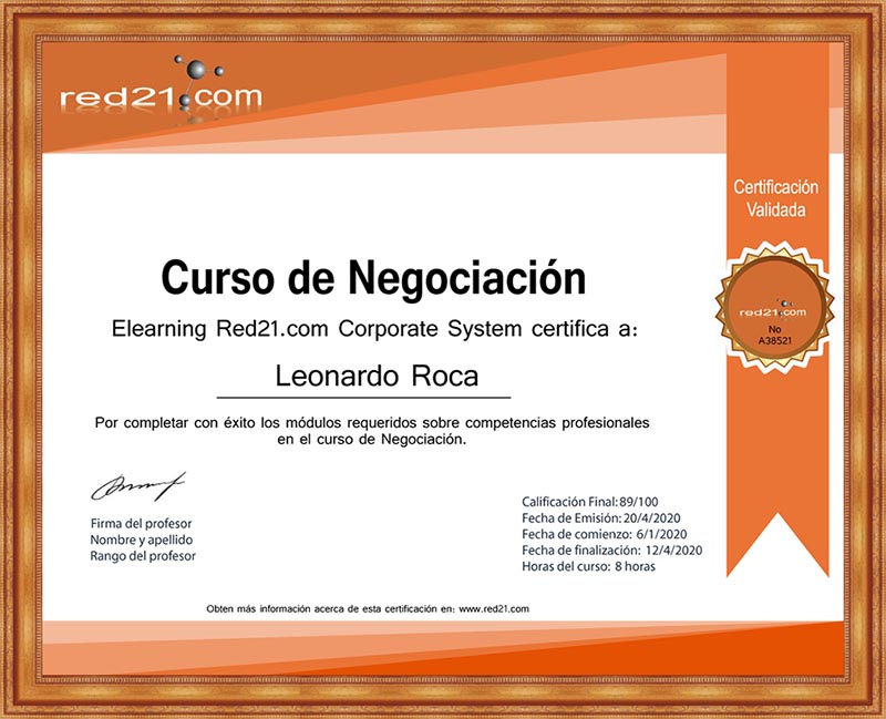 Al presentar, y aprobar la prueba final, recibirás un certificado de Aprobación del curso emitido por la Distance Learning Red21.com Corporate System reconocido por las principales empresas bajo la modalidad de enseñanza privada. A continuación un ejemplo de un certificado.