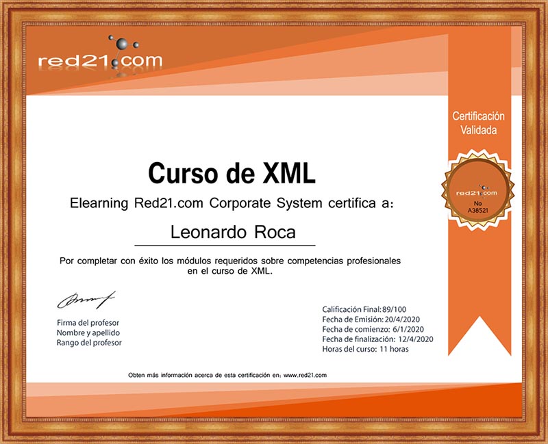 Al presentar, y aprobar la prueba final, recibirás un certificado de Aprobación del curso emitido por la Distance Learning Red21.com Corporate System reconocido por las principales empresas bajo la modalidad de enseñanza privada. A continuación un ejemplo de un certificado.